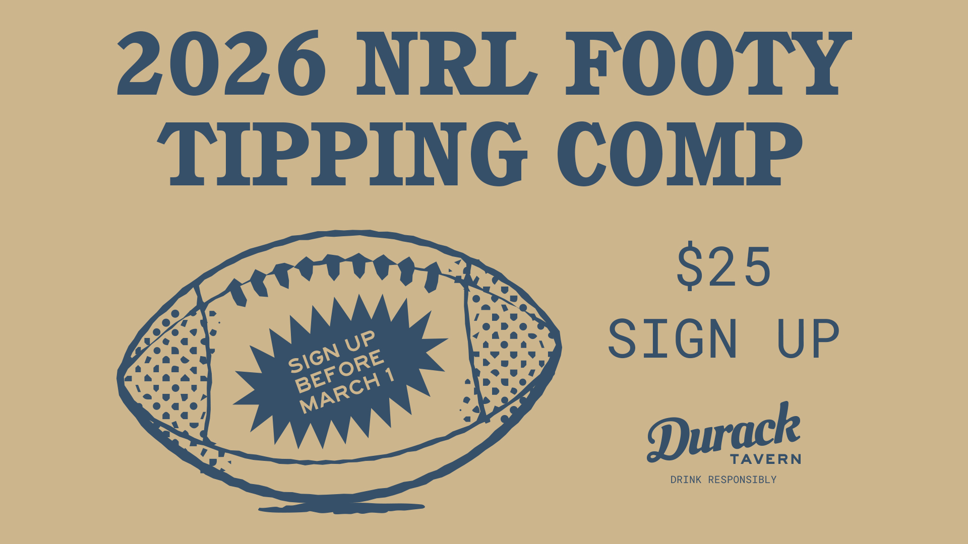 March 1 @ 8:00 am - 11:30 pm Event Series FOOTY TIPPING 2026 FOOTY TIPPING 2026 NRL season is back and that means FOOTY TIPPING season is as well! Sign up before March 1 in venue! Guaranteed Cash prizes and additional points for the perfect round.